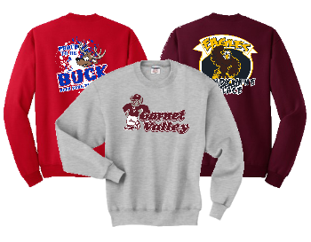 A very classic look no doubt is the classic sweatshirt. A school spirit wear staple since the beginning. Many colors are available, as well as many brands. Including Gildan, Jerzees and more.